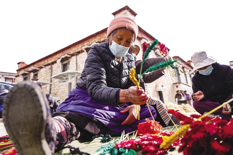 以前,高原植被稀疏,冬日里鮮花更是罕見。人們制作“羅薩梅朵”,讓這一束束“人造的花朵”盛開在冬日的高原上,這體現了西藏群眾對美好生活的熱愛和追求。正如央金所說,隨著西藏群眾物質生活水平的提高,色彩越來越鮮艷、品質越來越高的“羅薩梅朵”,正是西藏群眾多姿多彩幸福生活的絕佳體現。