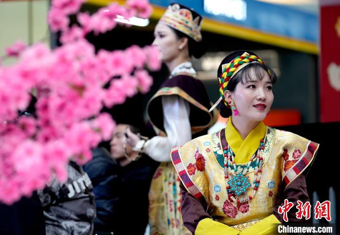 圖為西藏林芝第二十二屆桃花旅游文化節推介會(拉薩站)現場,身著藏裝的工作人員。李林 攝