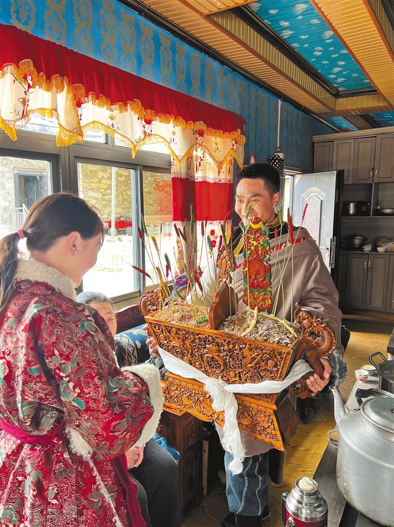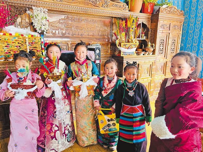 藏歷新年期間,在山南市加查縣崔久鄉,身著藏裝的小朋友們帶著家人準備的“切瑪”,前往村民家中請大家吃寓意五谷豐登的“切瑪”。