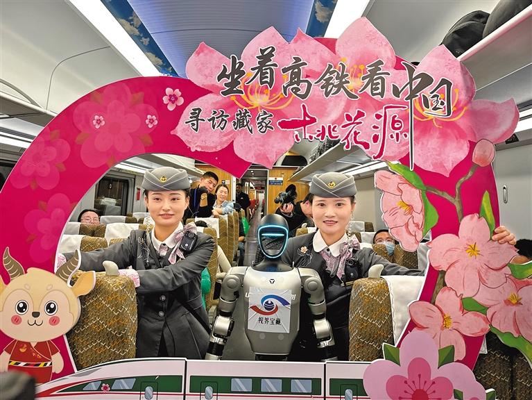 圖為拉林鐵路復(fù)興號(hào)動(dòng)車(chē)組乘務(wù)員與機(jī)器人多吉合影。記者 文鳳 通訊員 馬生明 攝
