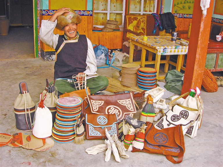 手藝人展示縣級非物質文化遺產俊巴皮雕作品 。