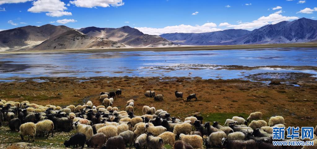 羊群經過西藏定結縣一處湖邊的草地(5月13日攝,手機照片)。新華社記者 沈虹冰 攝