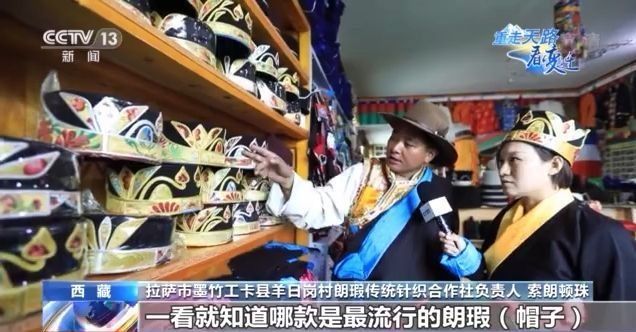 拉薩市墨竹工卡縣羊日崗村朗瑕傳統(tǒng)針織合作社負責(zé)人 索朗頓珠:我們這的姑娘小伙兒,一看就知道哪款是最流行的朗瑕(帽子),這是個去年款,這個是今年的款。你看,這兩個是牦牛角。朗瑕(帽子)很有我們藏族特色,同時也在與時俱進,看這些做工、花紋越來越精致了。