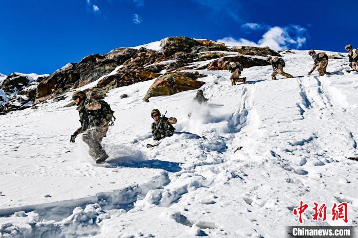 巡邏途中,官兵們順雪坡滑下,節省時間?!⊥踅?攝