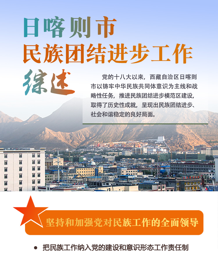 黨的十八大以來,西藏自治區日喀則市以鑄牢中華民族共同體意識為主線和戰略性任務,推進民族團結進步模范區建設,取得了歷史性成就,呈現出民族團結進步、社會和諧穩定的良好局面。[詳細]