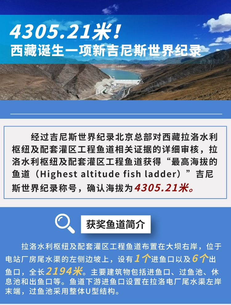 拉洛水利樞紐及配套灌區(qū)工程魚道獲得“最高海拔的魚道(Highest altitude fish ladder)”吉尼斯世界紀錄稱號,確認海拔為4305.21米。 [詳細]