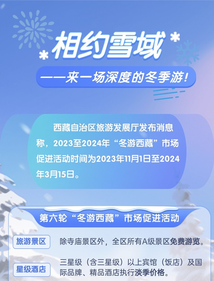 西藏自治區旅游發展廳發布消息稱,2023至2024年“冬游西藏”市場促進活動時間為2023年11月1日至2024年3月15日。[詳細]