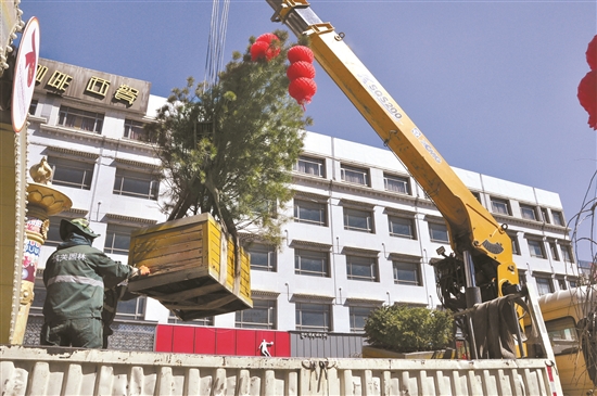 日前,西藏拉薩市城關區潔達園林公司組織工作人員對宇拓路上可移動的景觀花箱進行吊裝移除,為下一步更換新的綠化植物做準備。