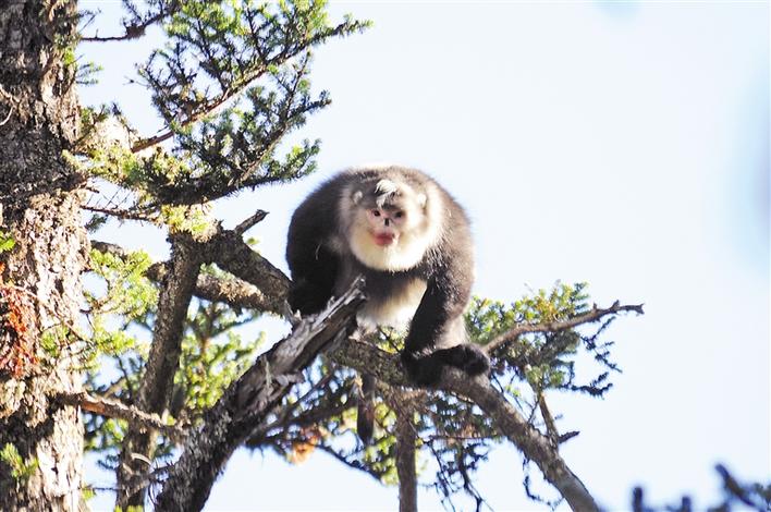 經過20余年的工作磨練,四郎次仁已會根據斷枝、糞便、叫聲來尋找滇金絲猴的蹤跡。“以前,不好發(fā)現,即便發(fā)現,也僅10多平方米有猴群;現在,很好發(fā)現,一發(fā)現,起碼30平方米都是猴群。”他說,“越來越不怕人的滇金絲猴,每年春季,都會從紅拉山頂下來,翻過214國道,到海拔相對較低的林子里吃東西、睡覺,待個10多天再回山頂。”