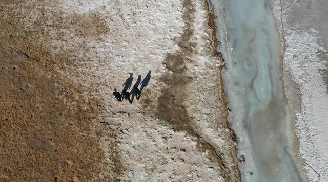 12月7日,站長趙新錄(中)與隊友鄧海平(左)、達才在可可西里索南達杰保護站管護區域內巡查(無人機照片)。