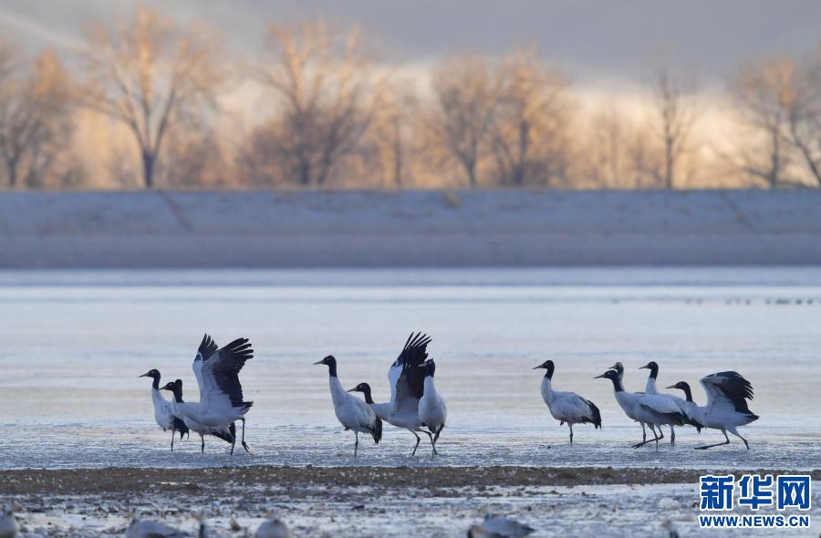 黑頸鶴在自然保護區里飛翔(2021年1月3日攝)。新華社記者 張汝鋒 攝