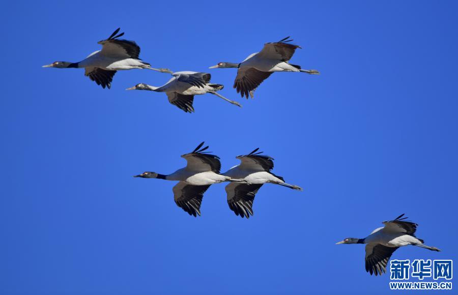 黑頸鶴在自然保護區上空飛翔(2021年1月3日攝)。新華社記者 張汝鋒 攝