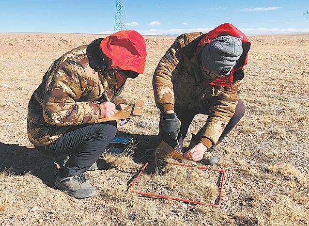 在另一塊平整的草地上,中科院西北高原生物研究所的賀福全和同伴正在采集植被樣本。賀福全說,他們的主要目標是了解這個區域草的長勢情況,并將植被樣本帶回實驗室進行分析,針對這塊草地的承載能力,測量草地產量,給直升機和無人機做地面驗證工作。