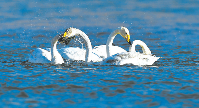 今冬,在海東市化隆回族自治縣群科鎮安達其哈村的黃河水面上,數百只大天鵝悠然覓食、棲息,美麗的大天鵝和清澈的黃河水勾勒出一幅美麗的冬日畫卷。