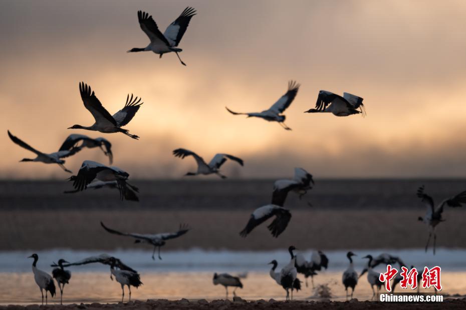 2月17日,西藏拉薩市林周縣黑頸鶴保護區內,黑頸鶴翩躚起舞、分外美麗。中新社記者 何蓬磊 攝