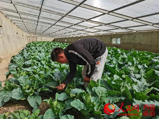 扎西旺杰在蔬菜大棚查看花菜長勢。 李海霞 攝