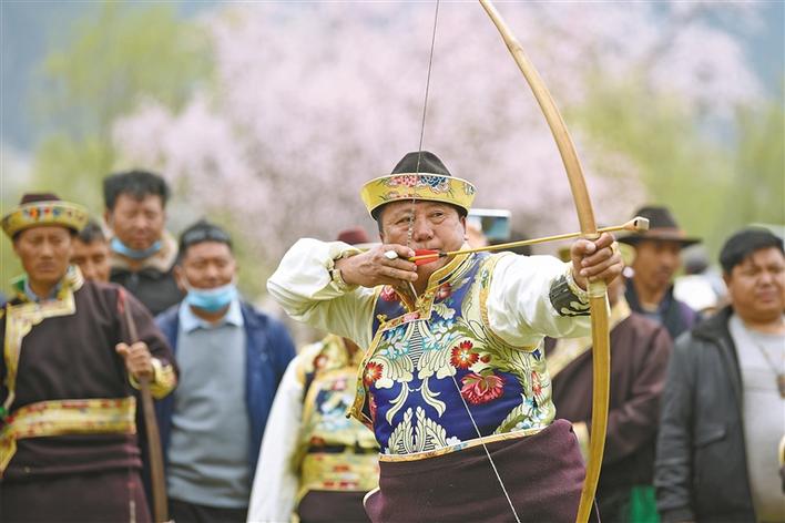 林芝桃花節開幕式上的文藝表演。張猛 王珊 攝