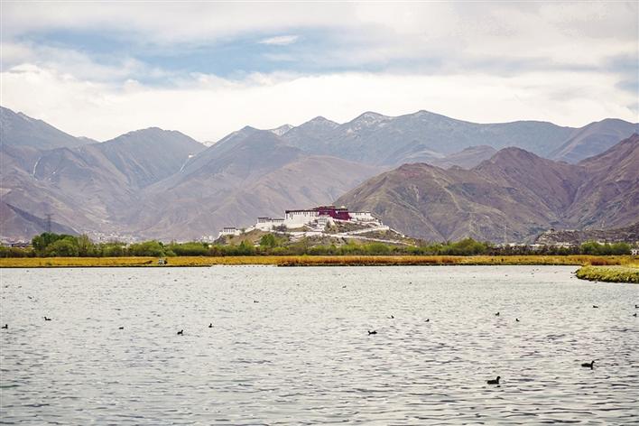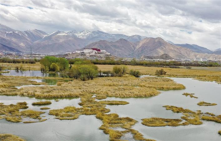 從拉薩市當(dāng)熱西路上向北望去,便能看到這塊北面靠山,東、南、西三面為市區(qū)包圍,面積12.2平方公里的濕地。遠(yuǎn)處,連綿起伏的山頂還覆蓋著薄薄的積雪,布達(dá)拉宮雄偉而秀美;近處,濕地內(nèi)隨意顯現(xiàn)出的一塊塊水泊,成群的候鳥(niǎo)在水中玩耍嬉戲、在藍(lán)天白云下飛舞。拾階過(guò)橋,一條木質(zhì)長(zhǎng)廊向濕地中延伸,只是我們這些不速之客的到來(lái),驚起水鳥(niǎo)無(wú)數(shù)。它們仿佛商量好似的沖上藍(lán)天,讓人為打擾它們的棲息而不安。