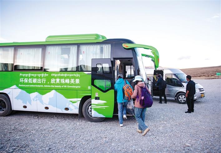 游客在珠穆朗瑪峰景區停車場轉乘環??蛙嚕?019年5月16日攝)。珠穆朗瑪峰景區內自2019年5月開始試運營清潔能源環??蛙?,以進一步平衡珠峰地區旅游發展與環境保護需要。新華社記者 孫非 攝