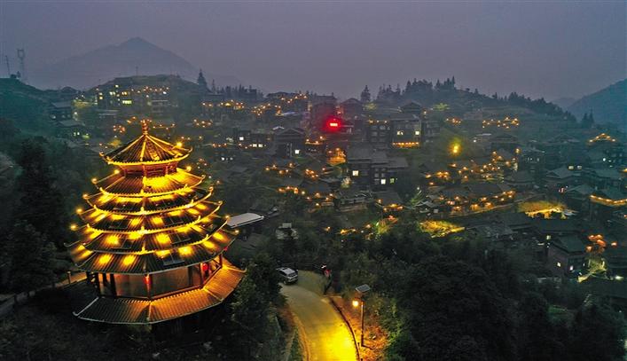 在廣西柳州市三江侗族自治縣八江鎮布央村,太陽能路燈和鼓樓上的太陽能裝飾燈讓鄉村的夜晚亮了起來(2020年12月28日攝,無人機照片)。 新華社發 (黎寒池 攝)
