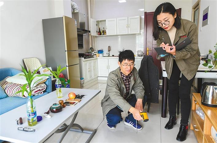 河北省安平縣一家熱力公司員工入戶測量室內地暖溫度(2019年11月15日攝)。2018年以來,安平縣利用玉米秸稈等農林廢棄物大力推行生物質能源供熱的供暖模式,減少污染排放,綠色節能型能源走進了千家萬戶。 新華社記者 李曉果 攝