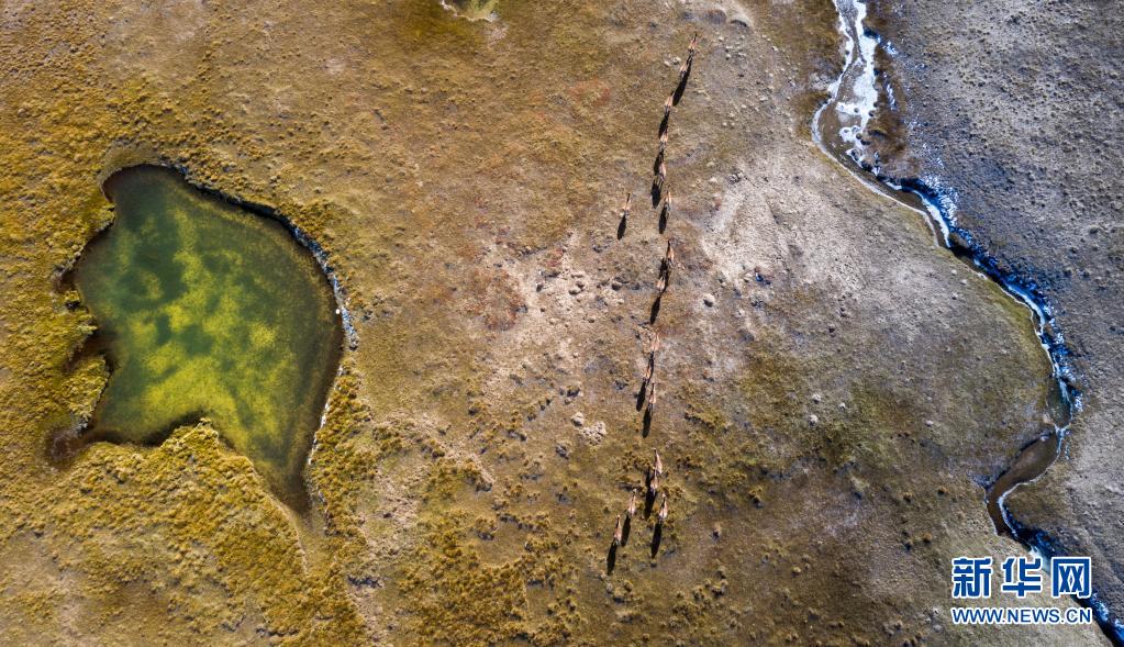 2019年10月19日,藏野驢在三江源地區活動(無人機照片)。新華社記者 吳剛 攝