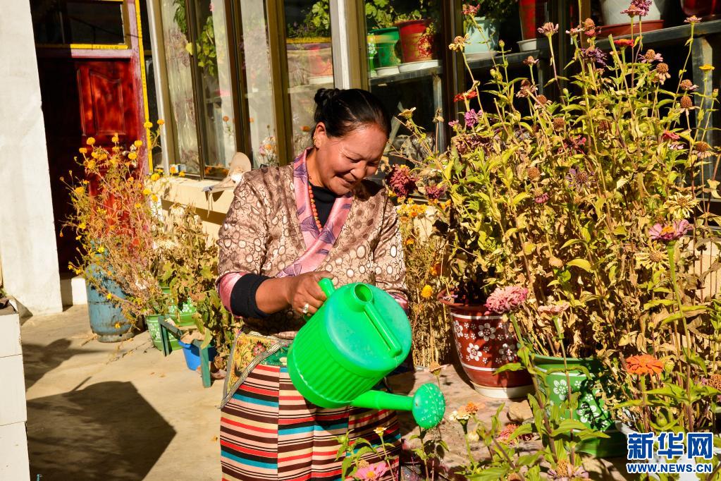 阿里地區札達縣札布讓村村民金珠德吉在院子里澆花。(2020年10月16日 攝 新華社記者 田金文 攝)