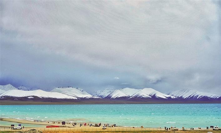 從羊八井出發至當雄縣,有一條向左的岔路,沿著這條路一直向前開約60公里,就能到達西藏最著名的景區之一——納木措。納木措,湖面海拔4718米,形狀近似長方形,東西長70多千米,南北寬30多千米,湖的東南部是直插云宵、終年積雪的念青唐古拉山主峰,清澈的湖水便來自念青唐古拉山融化的冰雪,北側則倚偎著和緩連綿的高原丘陵,廣闊的草原繞湖四周,似是將納木措小心翼翼地護在懷中。湖水顏色由罕見的碧藍與碧綠色相結合,是畫師都不易調出的顏色,遠遠望去,碧波粼粼的湖水與周圍的山脈、草原、藍天、白云交相輝映,令在場的人不禁連連感嘆仿佛置身于仙境之中。