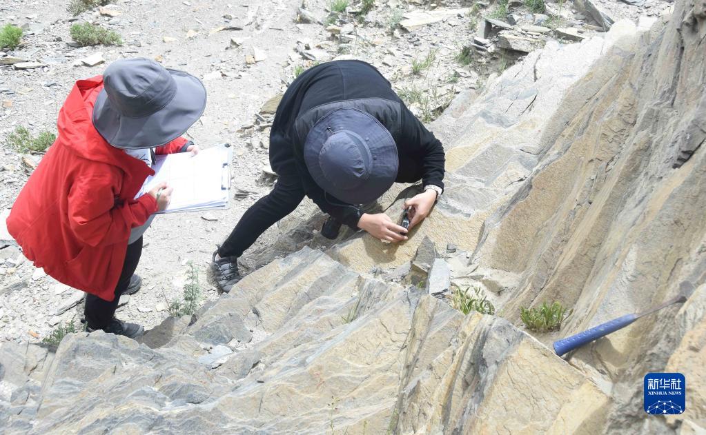 8月21日,在西藏日喀則市一處山體,科考隊員使用地質錘、羅盤等工具,進行地質災害鏈科考工作。新華社記者 杜剛 攝