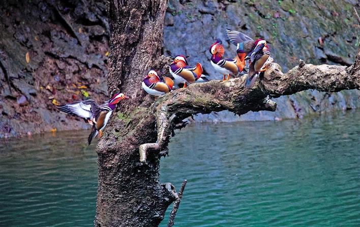 這是在湖南省邵陽市城步苗族自治縣境內的南山國家公園體制試點區拍攝的鴛鴦(2018年10月16日攝)。新華社發 (湖南南山國家公園管理局供圖)