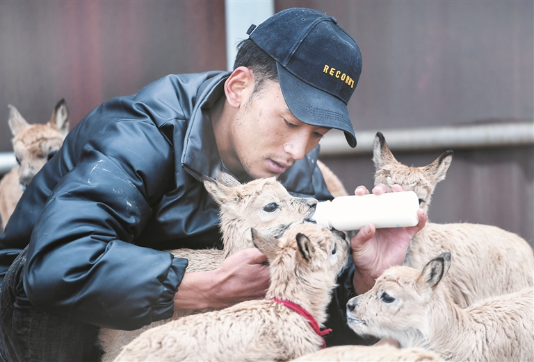 圖為可可西里國家級自然保護區卓乃湖保護站的工作人員才文多杰在給藏羚羊幼仔喂奶(2020年7月7日攝)。 新華社記者 薛玉斌攝