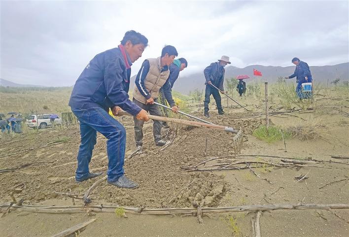 圖為農牧民群眾在山南市全國防沙治沙綜合示范區的沙地上種草。記者 史金茹 攝