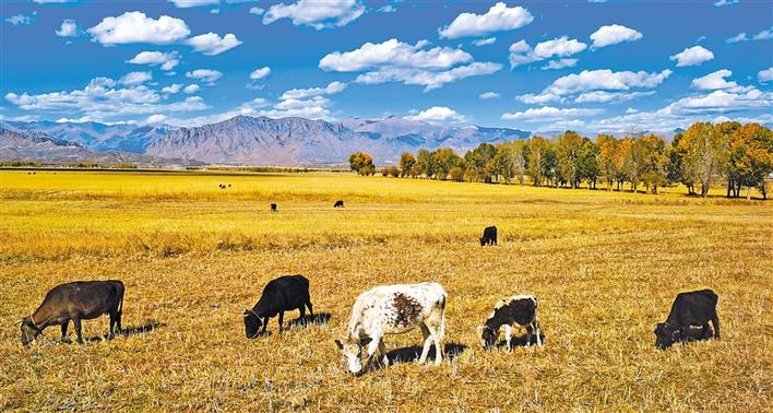 秋日的雪域高原魅力無限,藍天、白云、黃葉、碧水、雪山及金色草原交相輝映,宛如一幅幅色彩繽紛的優美畫卷。