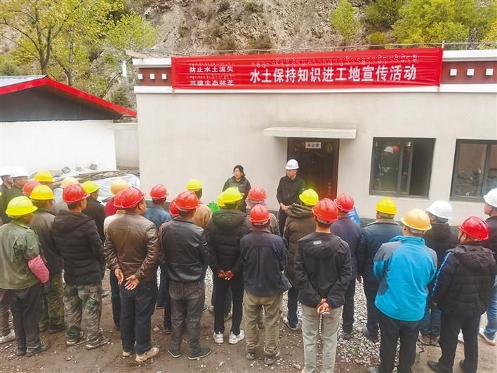 圖為林芝市水利局工作人員在朗縣拉多鄉項目工地向一線工人和管理人員宣傳水土保持知識。記者 張猛 攝