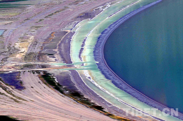 圖為班戈縣被賦予美麗傳說(shuō)的硼砂湖。它的周圍有9道寬寬的環(huán)湖圈,有綠色的,有棕色的,五彩斑斕,清晰可見(jiàn)(唐召明2001年攝)