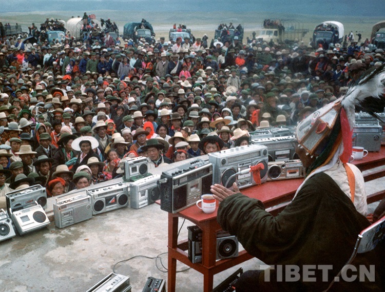 圖為說(shuō)唱藝人阿達(dá)在西藏那曲賽馬會(huì)上說(shuō)唱《格薩爾》的傳奇故事,臺(tái)上擺滿了牧民群眾的各式錄音機(jī)(才龍1985年前后攝)