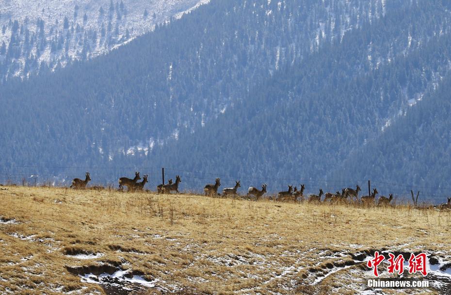 3月16日,成群的矮鹿在青海省海北藏族自治州祁連山國家公園青海片區草場上嬉戲。祁連山國家公園地處中國青海、甘肅兩省交界,總面積5.02萬平方千米,其中青海片區1.58萬平方千米。近年來,隨著當地生態環境持續改善,祁連山國家公園青海片區珍稀野生動物種群數量不斷增加。 中新社記者 馬銘言 攝