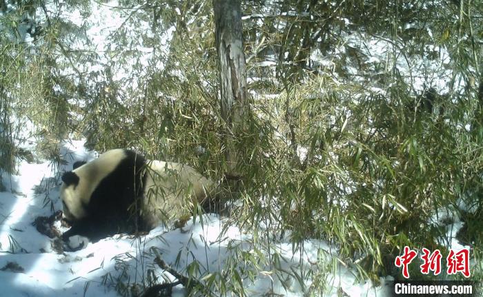 野生大熊貓雪中里喝水 蜂桶寨保護區 供圖