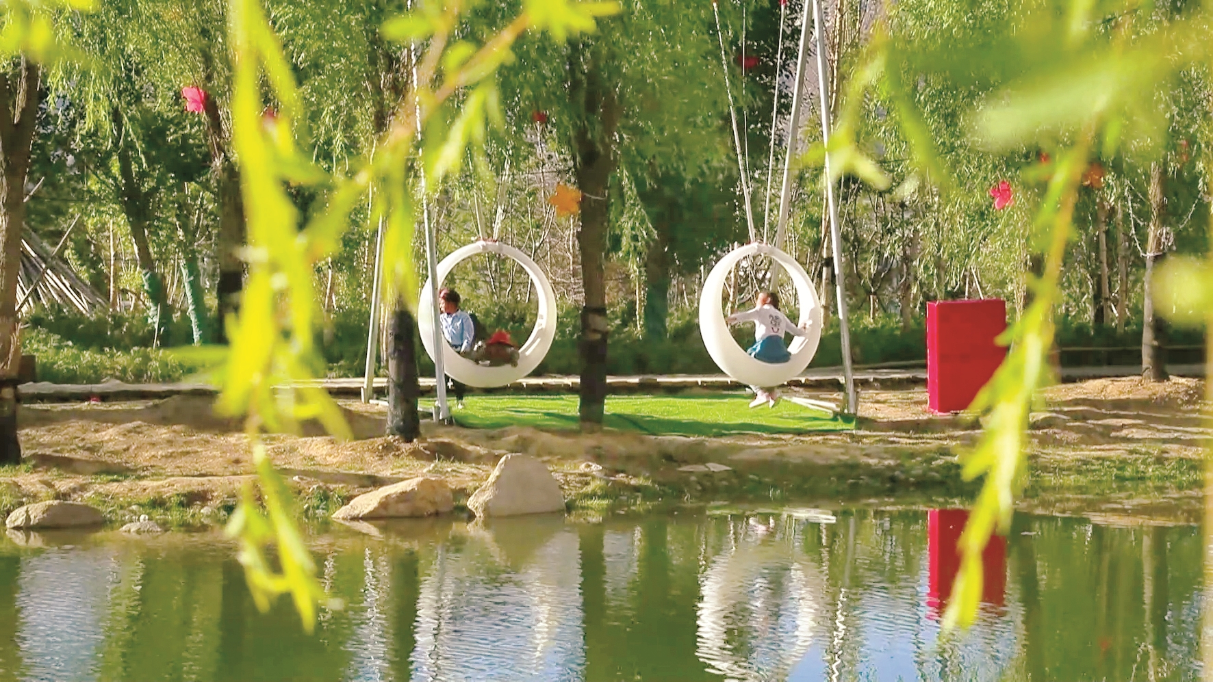 圖為孩子們在優美的公園綠水間盡情嬉戲。 拉薩融媒記者 蘭煉平攝