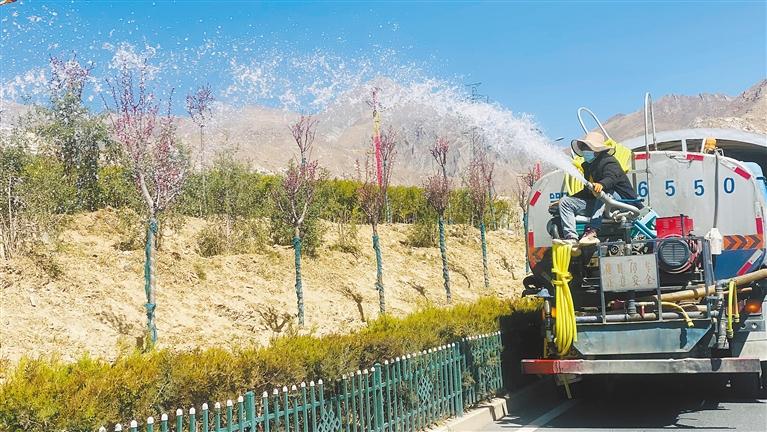 相關工作人員在為路邊樹木澆水。 記者 格桑倫珠 實習生 達娃宗巴 攝