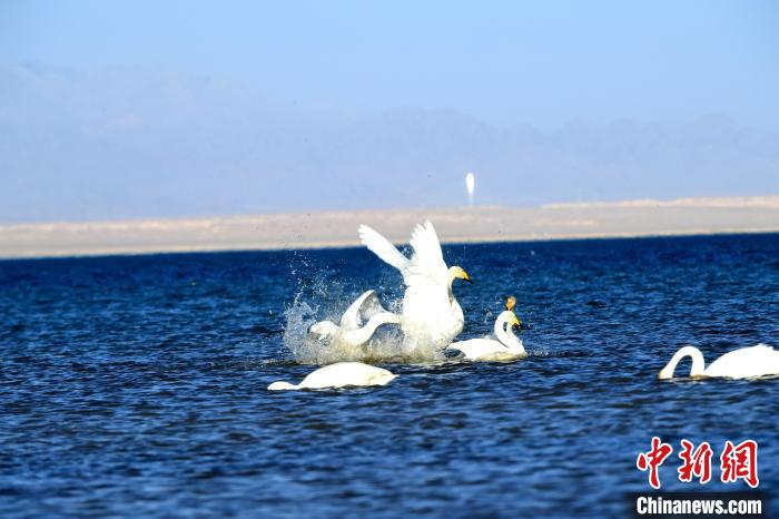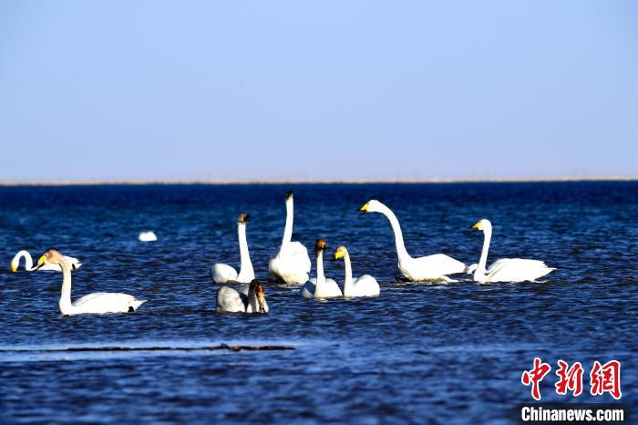 圖為天鵝群在湖中游蕩。 青海多美生態環保科技有限公司 供圖