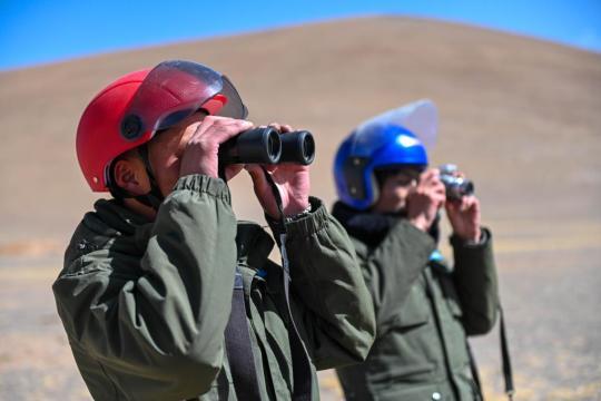 洛桑日達(左)與隊友正在觀察野生動物。新華社記者周荻瀟 攝
