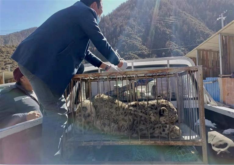 圖為工作人員將雪豹運送至林芝市野生動物收容救護站。 (西藏自治區林業和草原局提供)