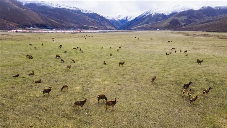 5月21日在類烏齊馬鹿國家級自然保護區拍攝的馬鹿(無人機照片)。新華社記者 周荻瀟 攝