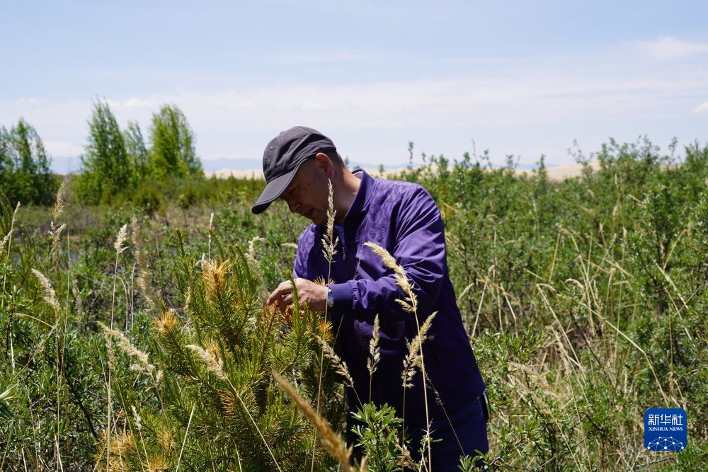 6月16日拍攝的馬文虎在克圖治沙點查看綠植長勢。新華社記者 李琳海 攝