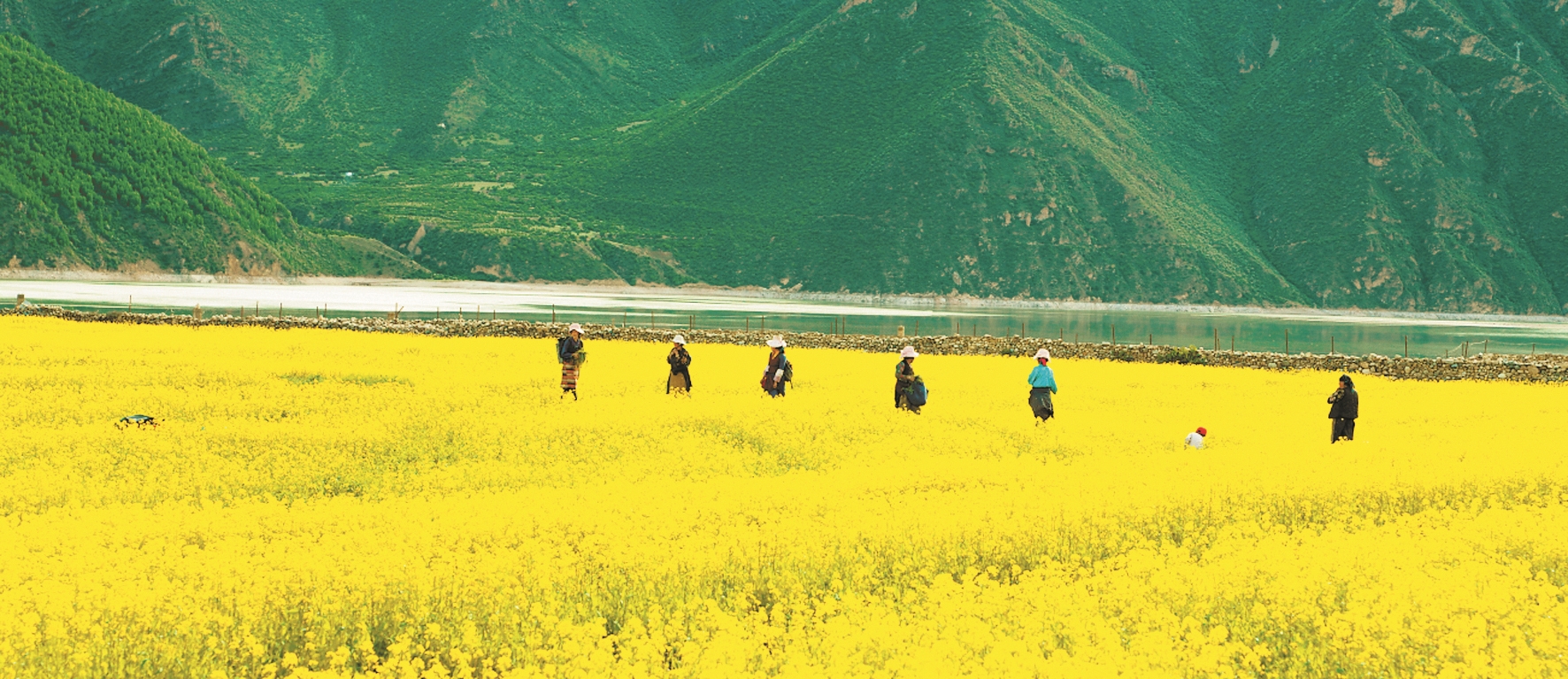 圖為墨竹工卡縣尼瑪江熱鄉幫達村村民在油菜田間勞作。西藏日報記者 旦增蘭澤攝