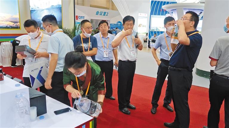 近年來,西藏加快發展飲用水產業,積極拓展飲用水產品銷售渠道,在區內外各種展覽會、展銷會、博覽會上大力推銷水產品。 圖為2020廈門國際投資貿易洽談會暨絲路投資大會上,與會者在展示展銷會現場品鑒西藏“地球第三極”產業發展有限公司生產的天然飲用水產品。(資料圖片)記者 王超 攝
