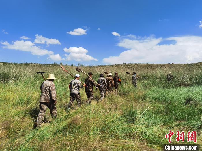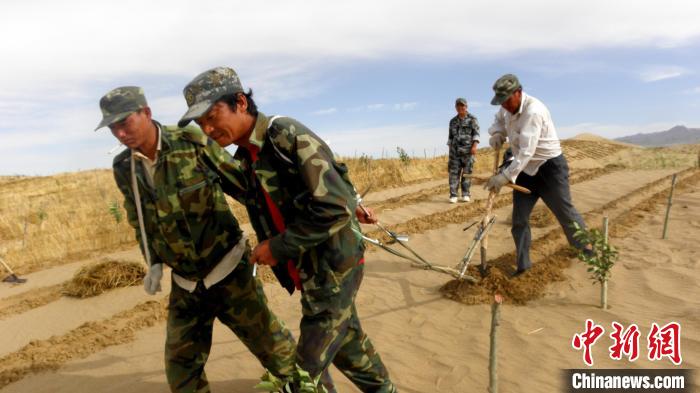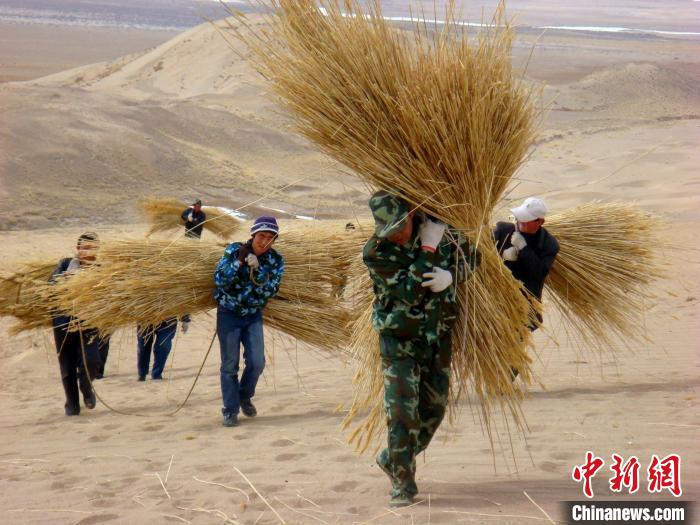 資料圖為固沙工程人工運草。 烏蘭縣委宣傳部供圖