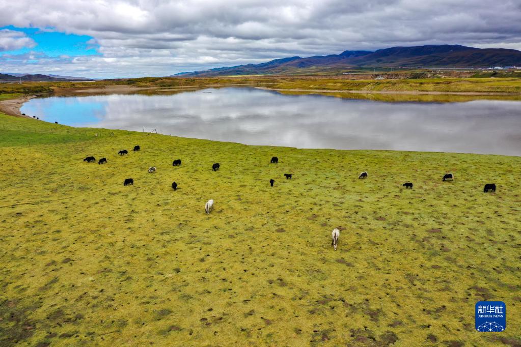牛群和馬在黃河瑪曲段干流沿岸的一處草地上吃草(9月17日攝,無人機照片)。瑪曲縣在2019年就實現了草畜平衡。新華社記者 郎兵兵 攝