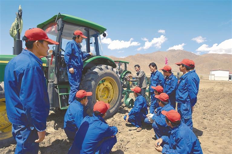 發展教育脫貧一批。2016年以來,累計落實義務教育學校基本建設資金84.4億元,實施教育基礎建設項目1433個,資助建檔立卡和農村低保大學生累計6.06萬人次,落實資助資金3.55億元。圖為西藏自治區白朗縣邀請山東農機技師對當地貧困戶開展培訓。